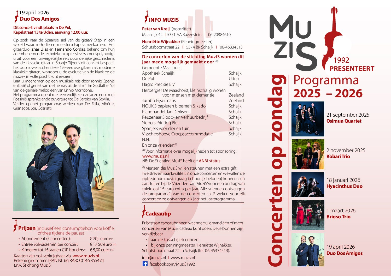 Stichting MuziS Kamermuziek concerten op zondag. Lees meer... Plastic Party 16 Oktober MARKANT Kobari Trio 2 November Opera Carmen 29 November MARKANT Ekaterina Livintseva 10 December MARKANT Het Zwanenmeer 11 December MARKANT Duo Hyacinthus 18 januari 2026 Brioso trio 1 Maart 2026 Duo Dos Amigos 19 April 2026 Dominic Seldis 22 April MARKANT For Seasons Ensemble Vond plaats op 7 September MARKANT Osimun Quartet Vond plaats op 21 September